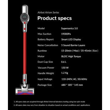 The Airbot SuperSonics 3.0 Vacuum Cleaner is a powerful and versatile handheld cleaner. With a voltage range of 110-240V and a power output of >1800W, it easily mops, sweeps, and suctions, making it perfect for car and household cleaning. Its lightweight design and long 45-minute working time make it ideal for extended use.