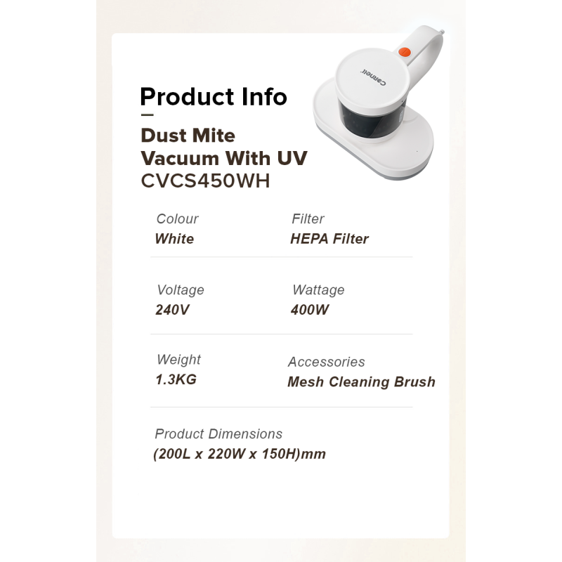 The Cornell UV Dual Mite Vacuum - CVC-S450WH boasts a powerful 400W motor and HEPA H11 filter to effectively eliminate microorganisms, such as dust mites and bacteria. With a convenient one button operation and a 4 meter cable length, this vacuum makes cleaning a breeze. Keep your home clean and healthy with the Cornell UV Dual Mite Vacuum.
