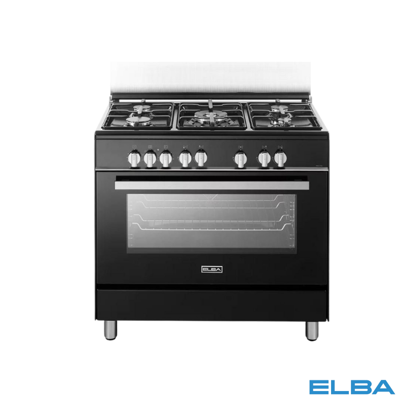 Introducing the Elba Standing Gas Cooker with Electric Multi-Function Oven - CBB 965M. Enjoy precise cooking with its high-performance gas burners and spacious 90cm width. The modern black design adds a sleek touch to your kitchen. With easy-to-use knobs and flame failure safety devices, it's not only functional but also safe. Plus, its stand-alone design offers flexibility in placement.