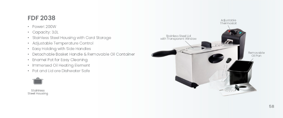 Get perfectly fried foods every time with the Faber Deep Fryer - FDF-2038. With a powerful 200W motor and a spacious 3.0L capacity, this fryer makes cooking a breeze. The stainless steel housing with cord storage and adjustable temperature control provide convenience and precision. The detachable basket handle and oil container, along with the enamel inner pot, make for easy cleaning. Plus, the immersed oil heating element and dishwasher safe components make this fryer a must-have in any kitchen.