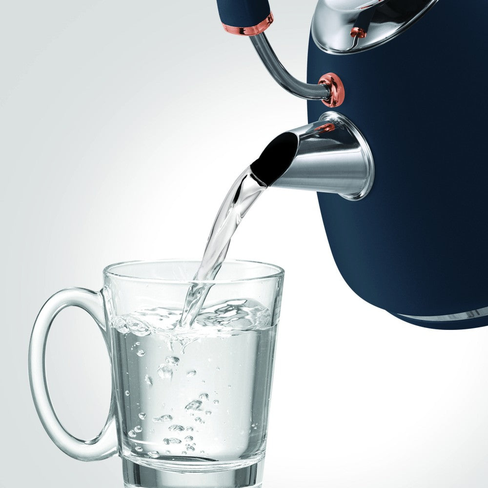 This Morphy Richard Accents Pyramid Midnight Blue Kettle combines style and function with its water level indicator and removable limsecale filter. Its 360-degree rotational base makes it easy to use, while its voltage of 220-240V and power of 3.0kW provide efficient performance. With a capacity of 1.5L, enjoy boiling water in no time.