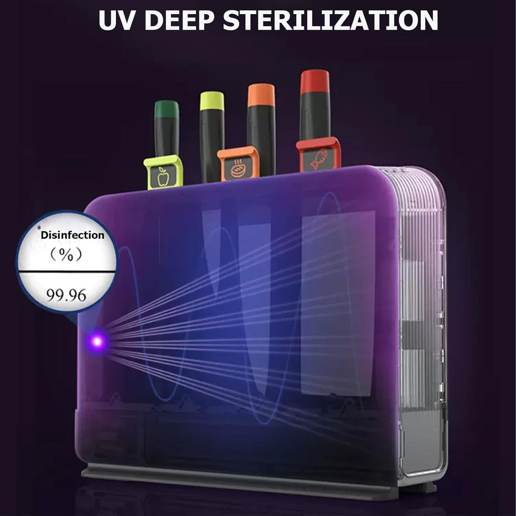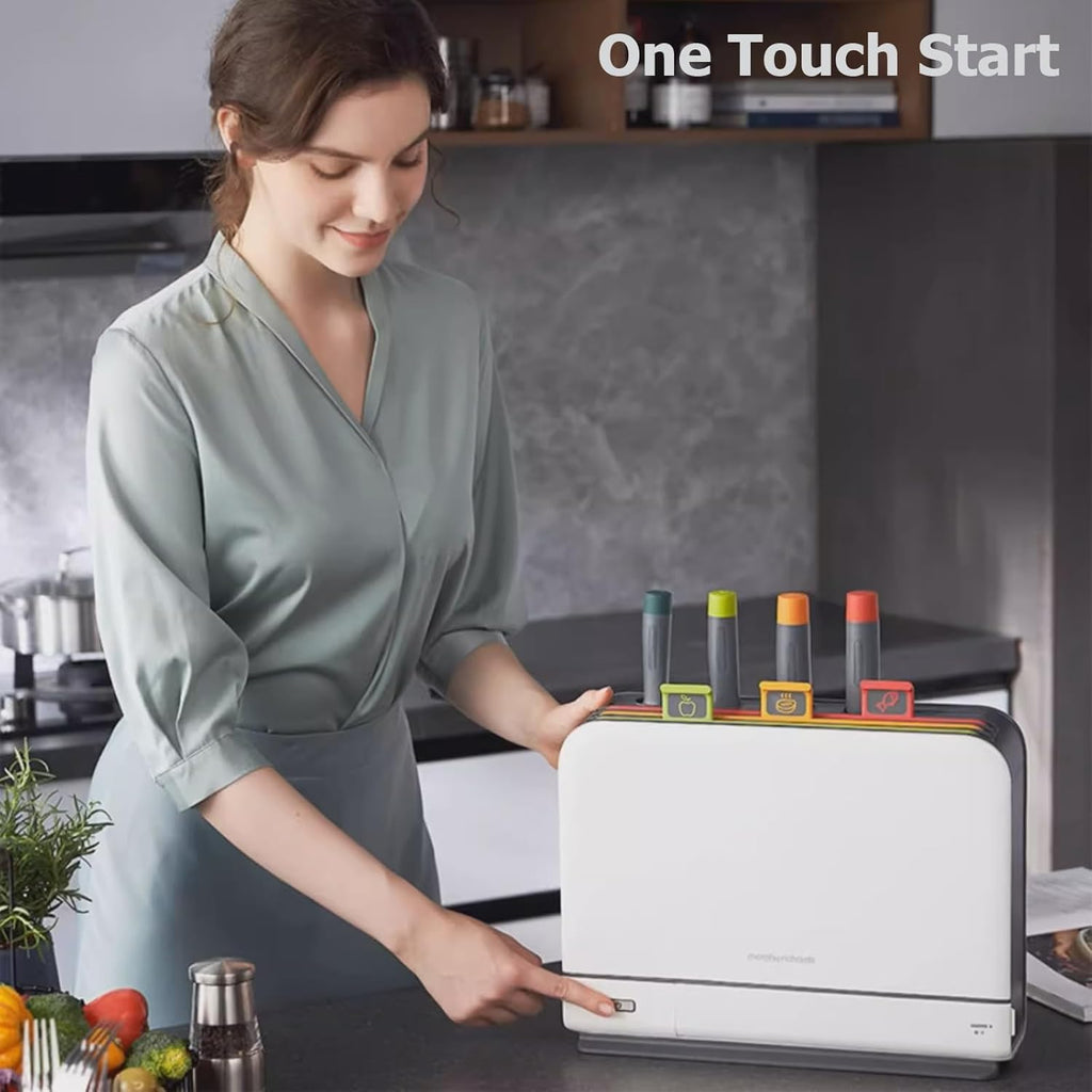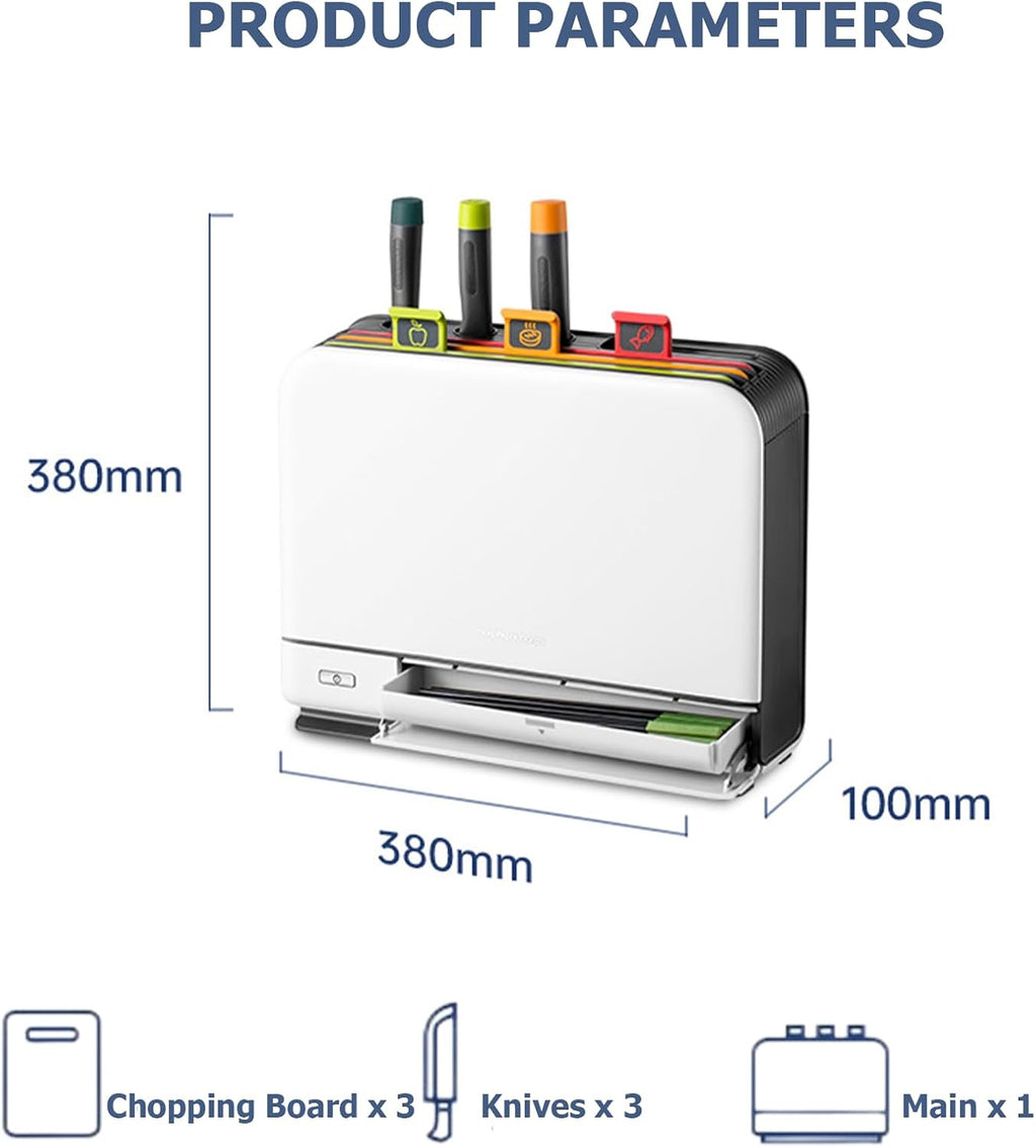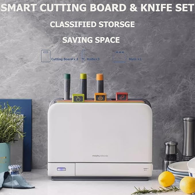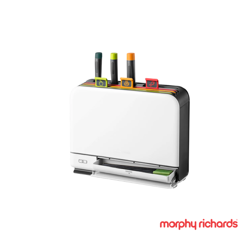 Efficiently and hygienically prepare your food with the Morphy Richards Knife & Chopping Board Sterilizer. Its thoughtful design includes color-coded chopping boards and coordinating stainless steel knives, with features such as a guiding grid, grater, and non-slip feet. The compact storage case keeps everything organized and clean. The Morphy Richard Knife & Chopping Board Sterilizer is a must-have for any kitchen. With one press of a button, its UV sterilisation process eliminates up to 99.9% of harmful bacteria in just 5 minutes. The cordless design and USB charging make it convenient and the 30-day battery life ensures long-lasting use. Keep your kitchen clean and your family safe with this easy-to-use sterilizer.
