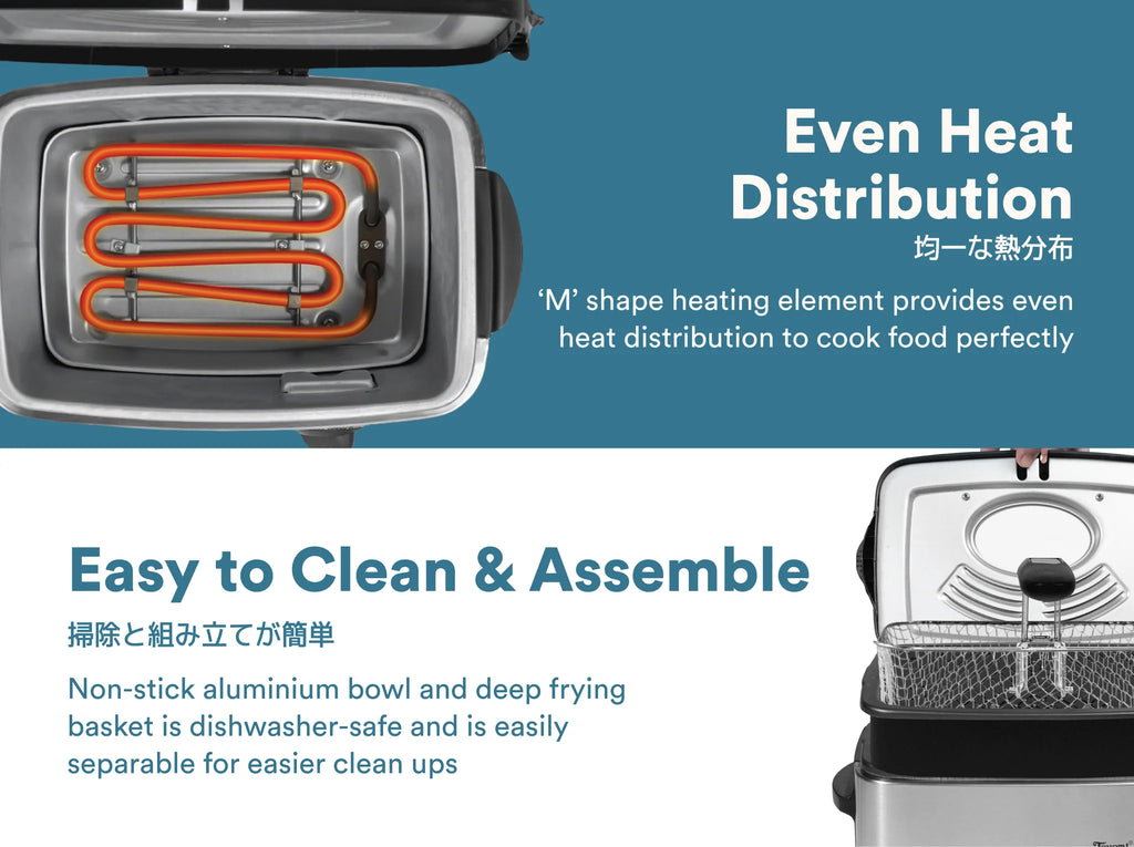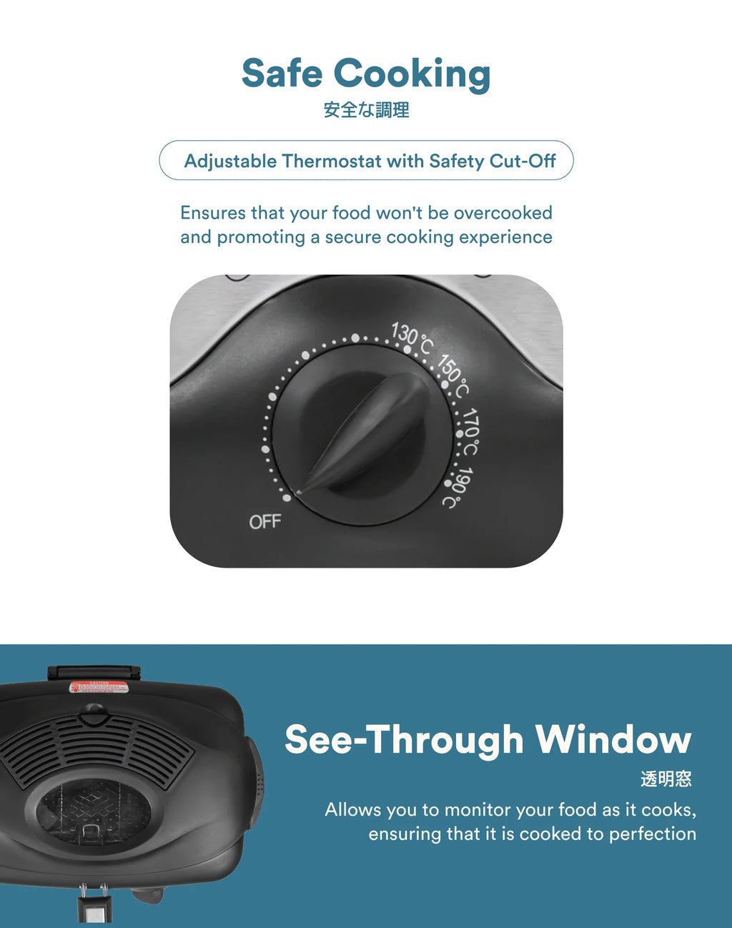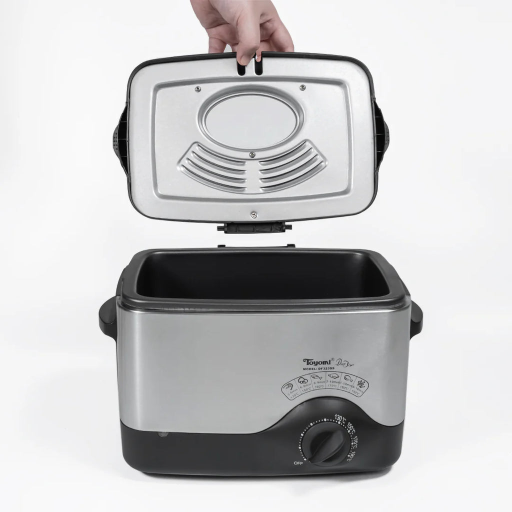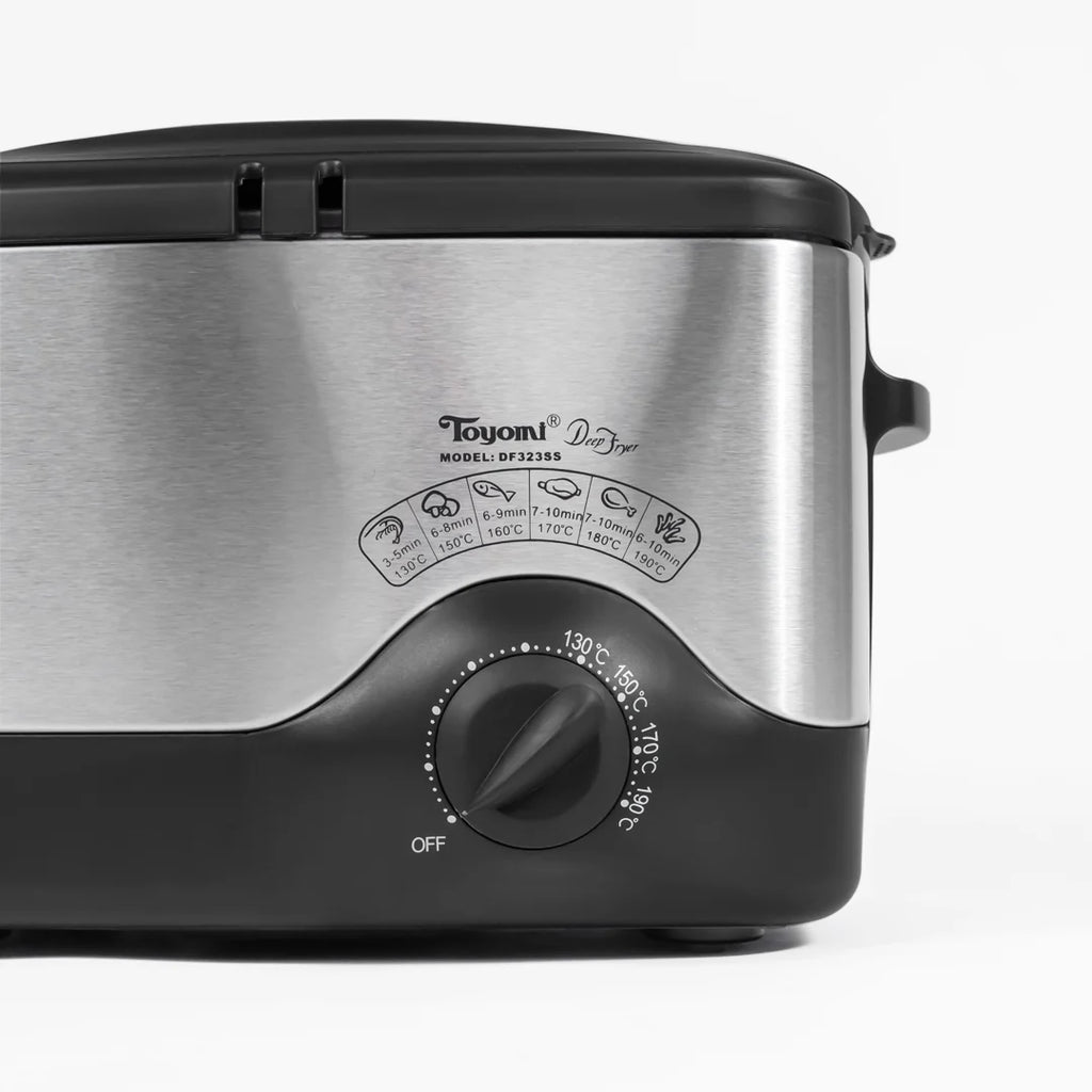 The Toyomi Deep Fryer - DF323SS is the perfect addition to any kitchen counter top. Its compact design allows for easy storage and its dishwasher safe bowl basket and lid make for hassle-free cleaning. With a large see-through window on the lid and an adjustable thermostat with safety cut-off, this fryer provides convenient and safe frying every time. The removable non-stick aluminum bowl and removable lid make for effortless cleaning, and the exclusive professional brushed stainless steel finish adds a touch of style to any kitchen.