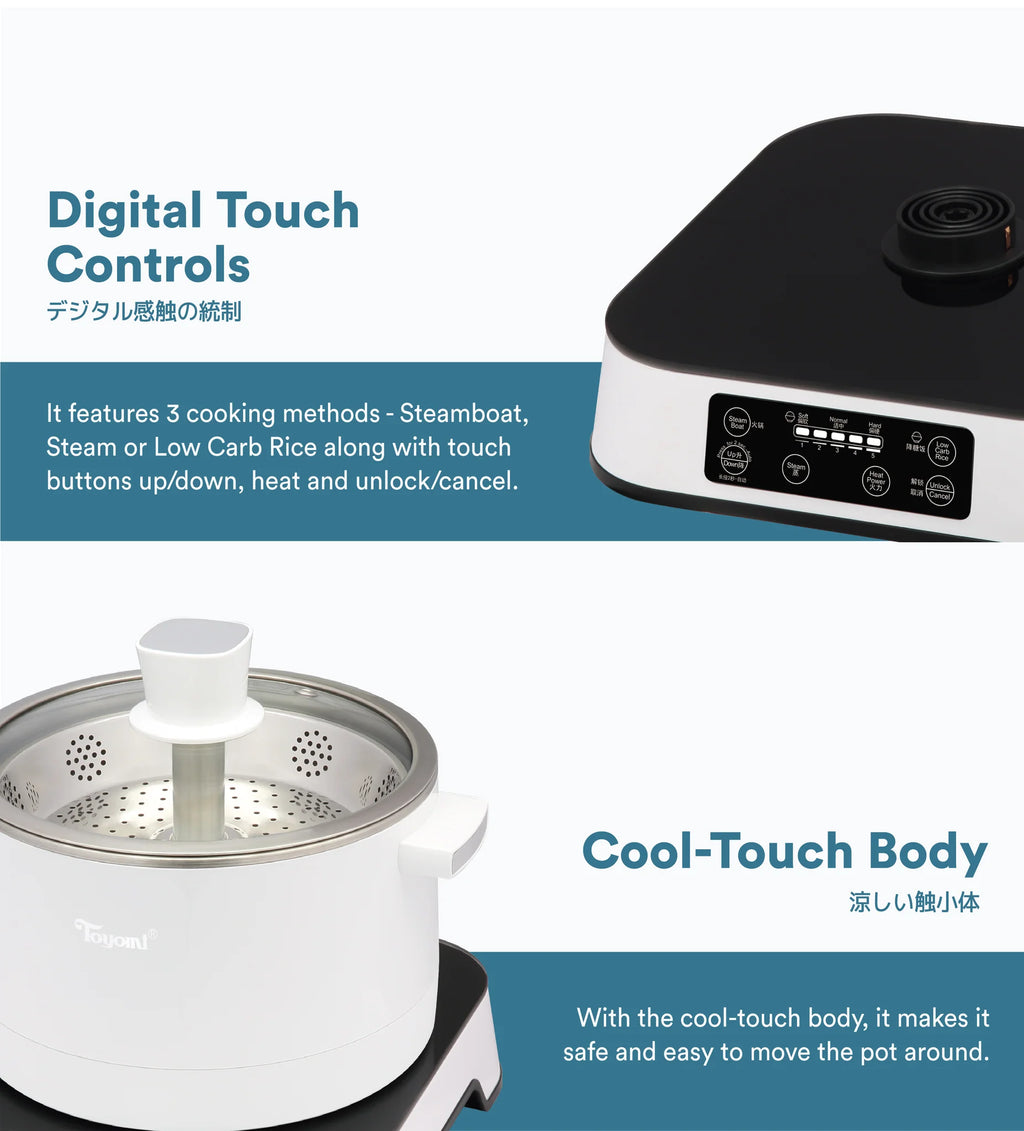 The Toyomi Smart Steamboat - SSB-6625 features powerful 1500W heating that cooks food in just 6 minutes. Its cool-touch body and SUS 304 stainless steel inner pot ensure safe and easy handling. With a touch screen to select functions and options for steaming and cooking rice, this steamboat also offers overheating protection for worry-free use. Get healthy meals in a flash with the Toyomi Smart Steamboat.