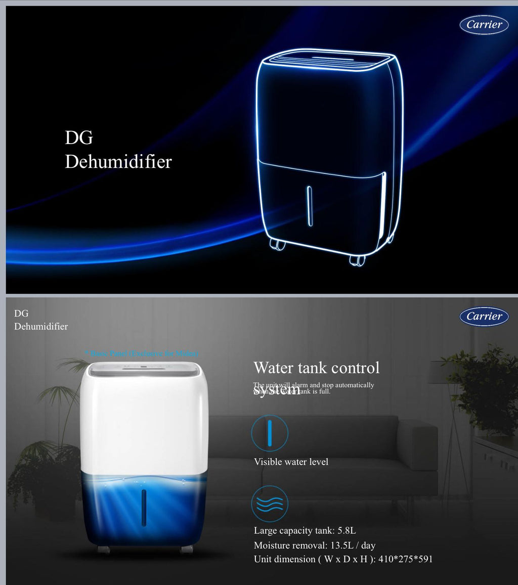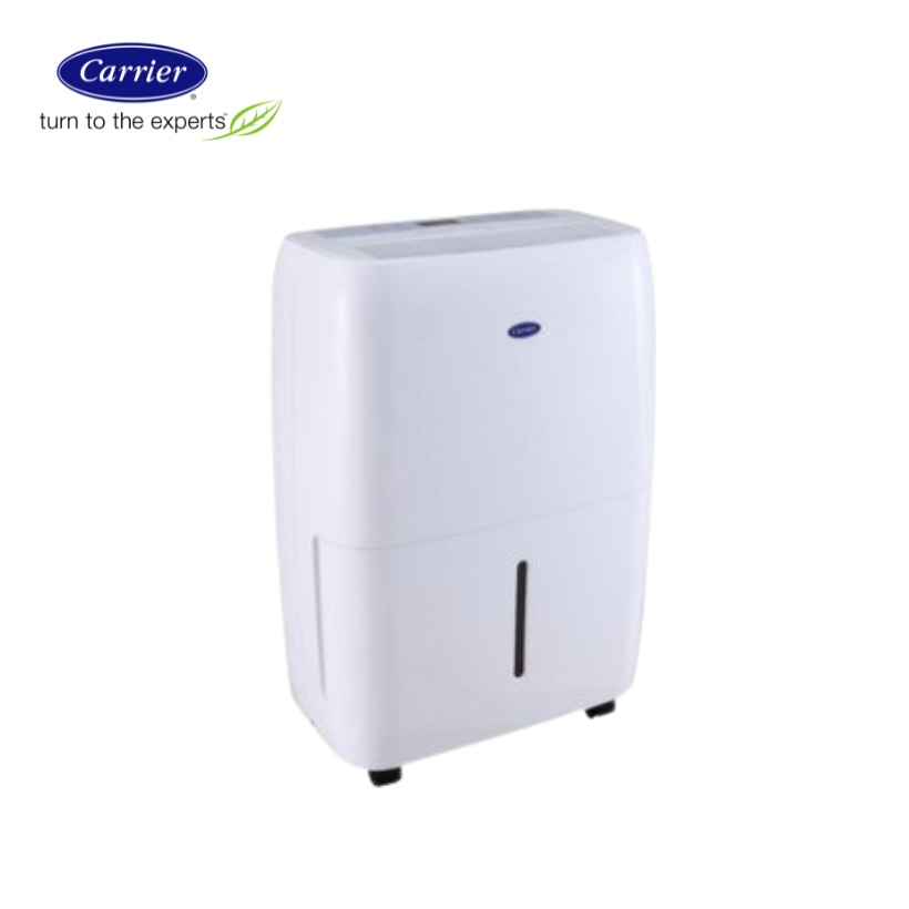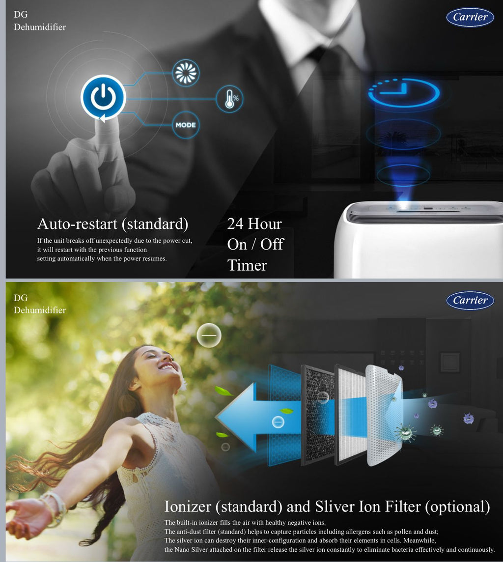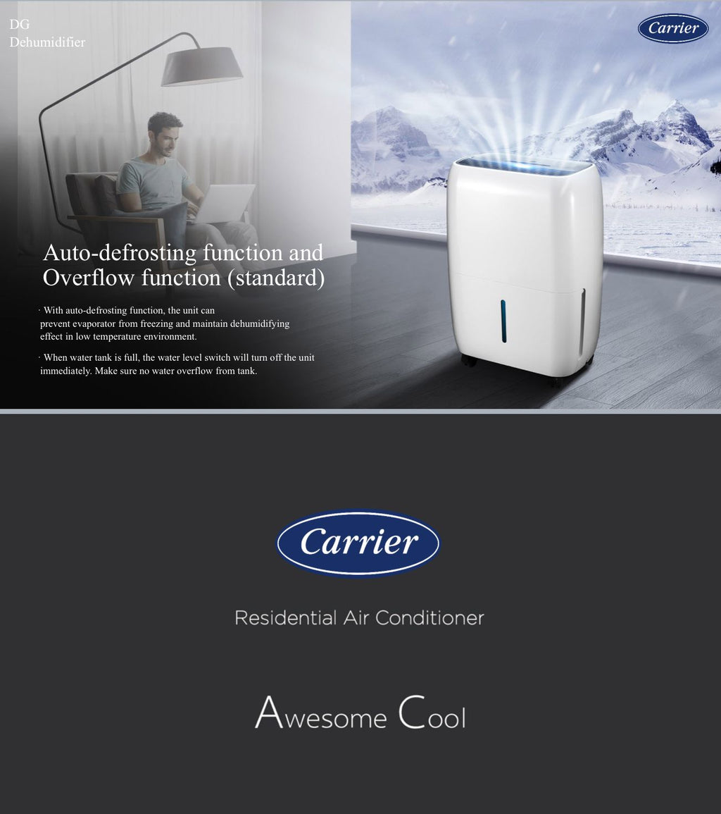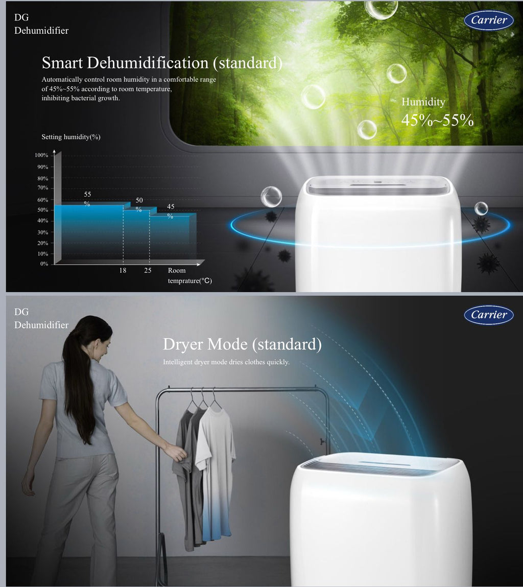 Dehumidifier Carrier Main characteristics For spaces up to 190-230m2 With an ionizer, it creates a climate of wellness as it rejuvenates the air with negatively charged ions. Removes pollen and dust while neutralizing bacteria and combats unpleasant smells, such as cigarette smoke, for a cleaner, healthier indoor environment. Smart Drying Mode that stops automatically after 10 hours of operation for reduced power consumption. Electronic control system and precision sensor to measure the relative humidity of your space. The illuminated LCD display shows the percentage of moisture required during setting and then the percentage of humidity in your area. Overflow protection: When the water tank is full, the water level switch will immediately turn off the appliance. Alternatively, it is possible to connect with a drain pipe so that you do not need to empty the water tank. Smart-clean, designed for high performance, with anti-corrosion protection against mold and unpleasant odors. Dehumidifying capability even at low ambient temperatures. Smart dehumidifying mode with which the unit automatically controls room humidity in a 45% ~ 55% range depending on room temperature. Auto restart after power failure. Air cleaner, anti-dust pre-filter, removes dust. Container with water level indicator. Practical carrying handle.