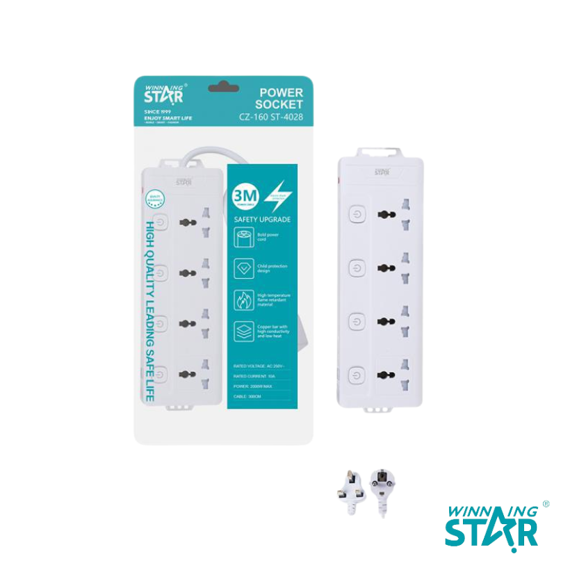 The Winning Star Extension Socket 3-Way provides secure and efficient power distribution with its VDE plug and PP flame retardant material. With 4 outlets and 4 switches, it allows you to connect multiple devices and control the power supply easily. The 3m pure copper charging wire ensures fast and reliable charging. Invest in this multi-functional socket for a hassle-free electrical experience.
